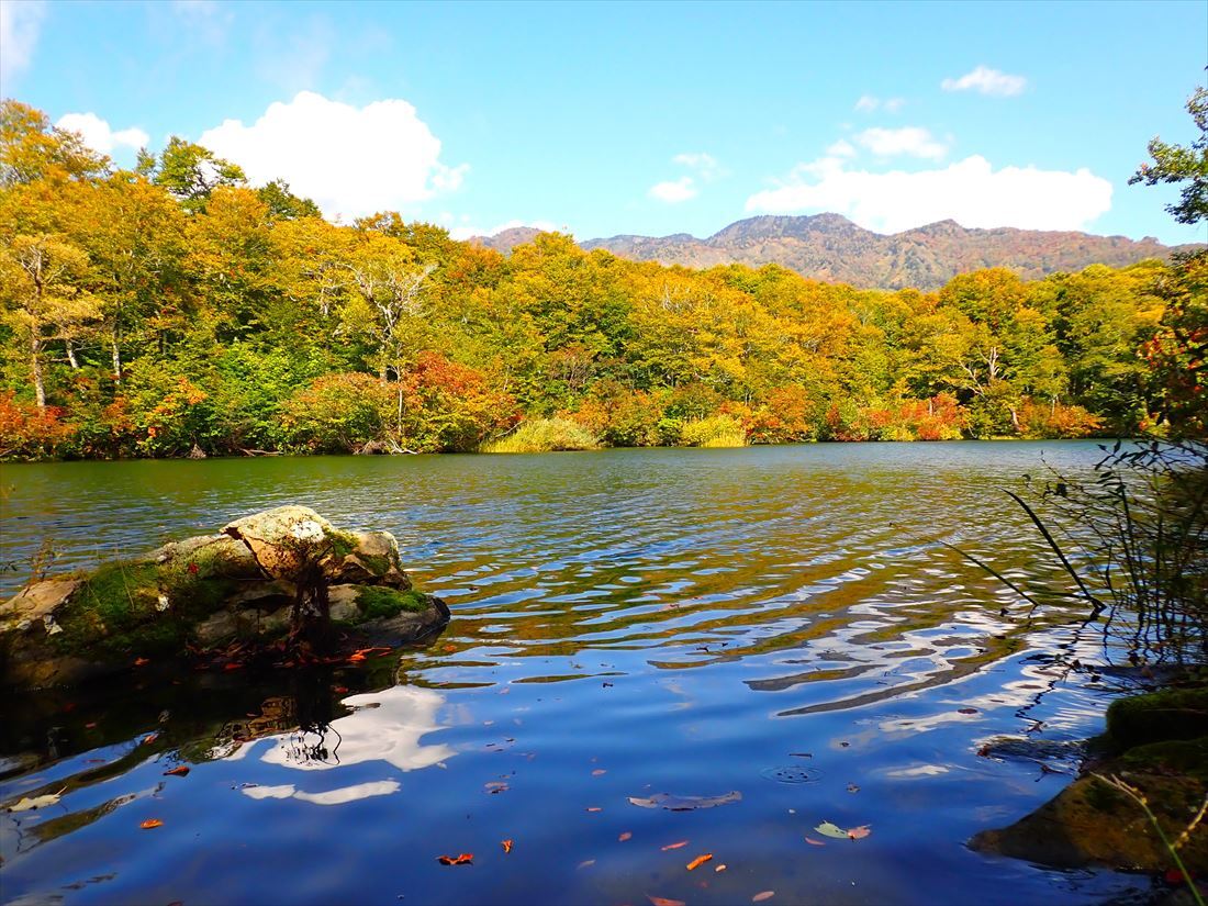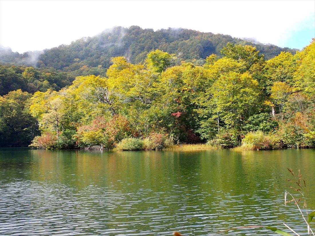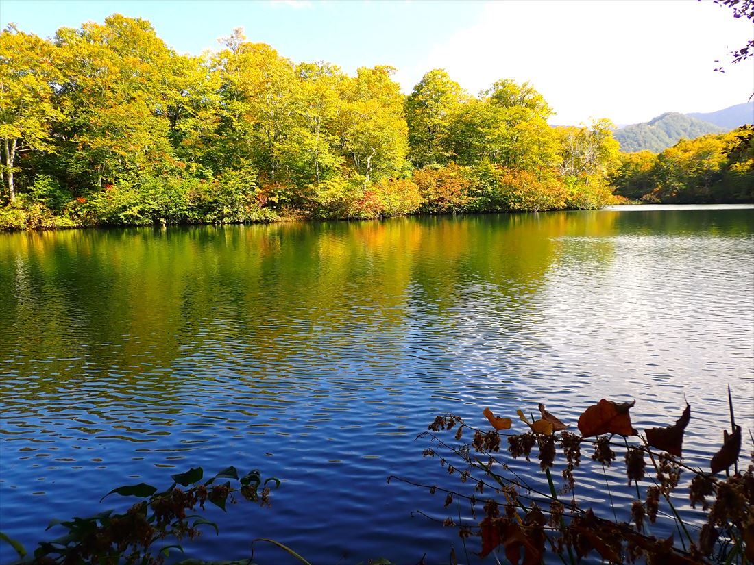 雨飾山の登山口からお車で約5分ほどの紅葉の名所・鎌池も色づきが始まっています。