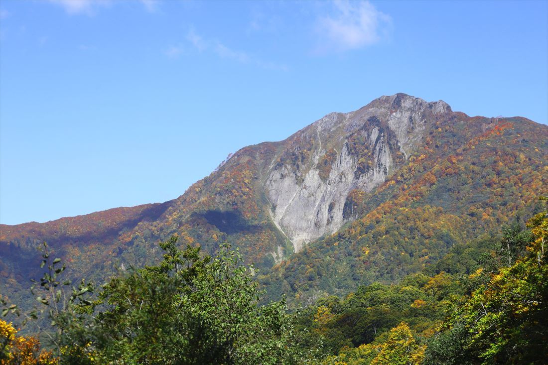 小谷温泉奥の湯・雨飾荘でございます。 昨日の雨も止んで、絶好の秋晴れとなりました! 雨飾山も現在紅葉のピークを迎えております。 山頂から麓にかけて色づきが進んでいるのが分
