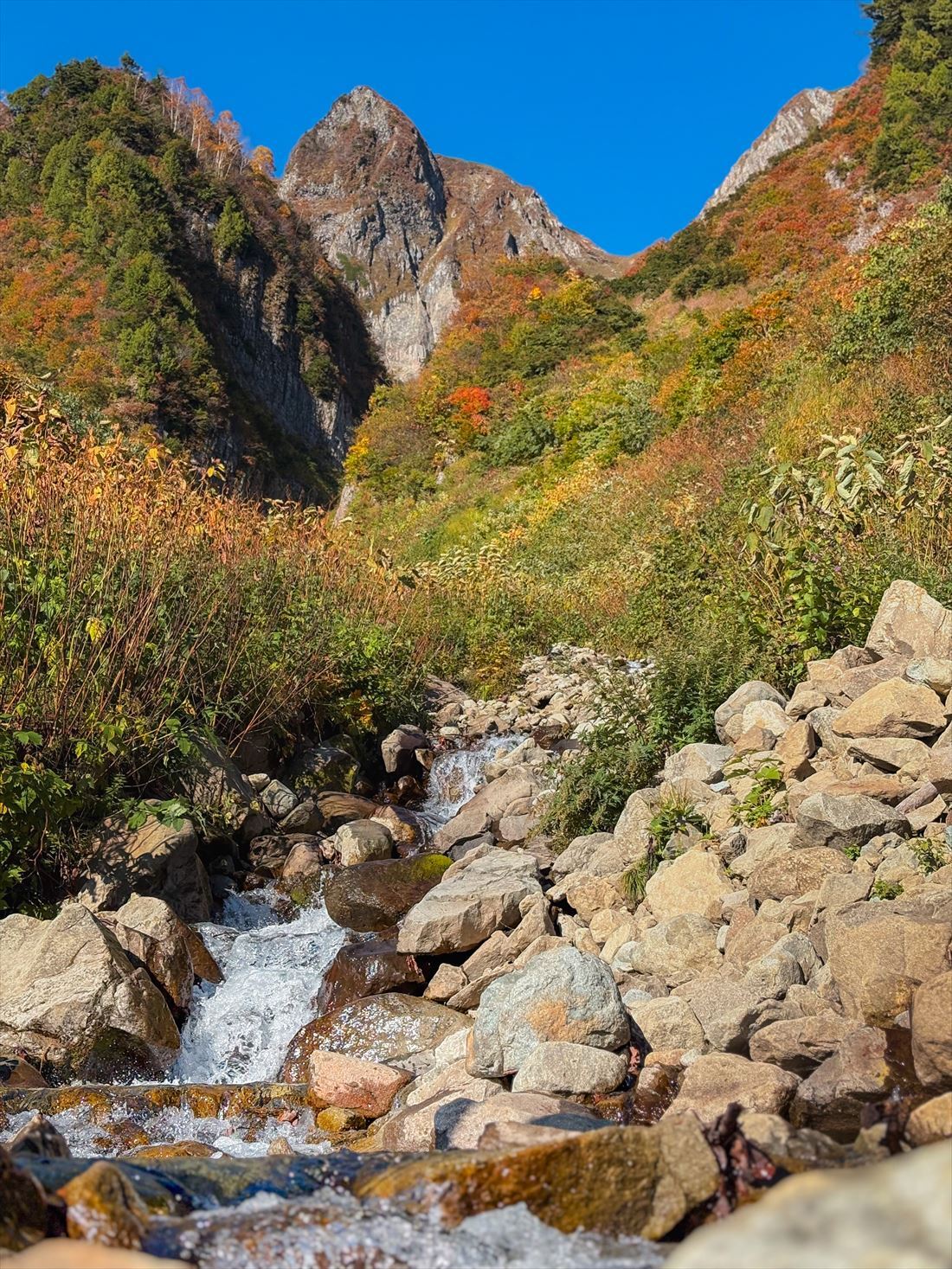 小谷温泉奥の湯・雨飾荘でございます。 すっかり秋めいた気候になりましたが、今日は紅葉の季節を迎えつつある雨飾山のご紹介です。 荒菅沢は先日来の雨で少し増水も見られましたが、現