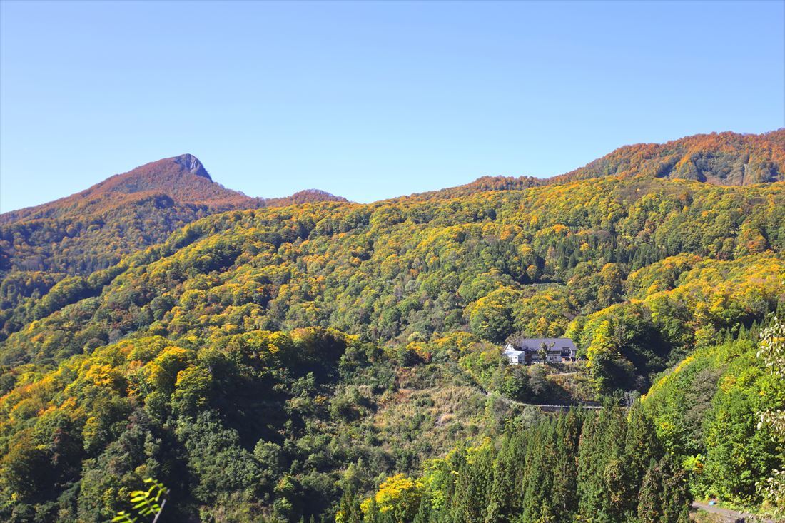 小谷温泉奥の湯・雨飾荘でございます。 雨飾高原が1年で最も華やかに彩られる季節になりました。 山間に立つ1軒宿の当館(雨飾荘)が紅葉に彩られた山々に囲まれているのがよくわかり