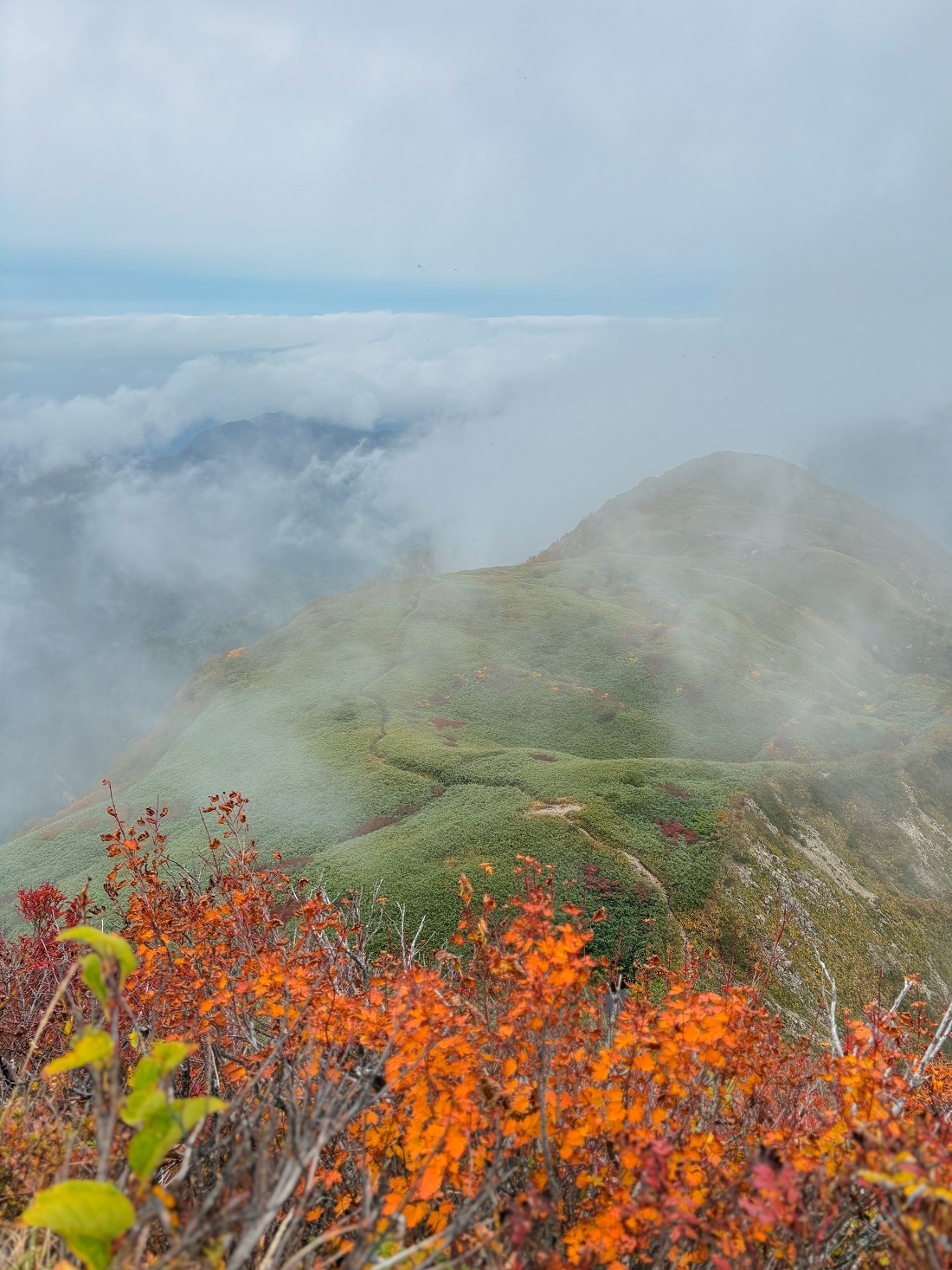 小谷温泉奥の湯・雨飾荘でございます。 10月10日、快晴とはいきませんでしたが、この秋最高の雨飾山登山日和です! 頂上付近から徐々に色づきも進んで、現在7~8分といったところ