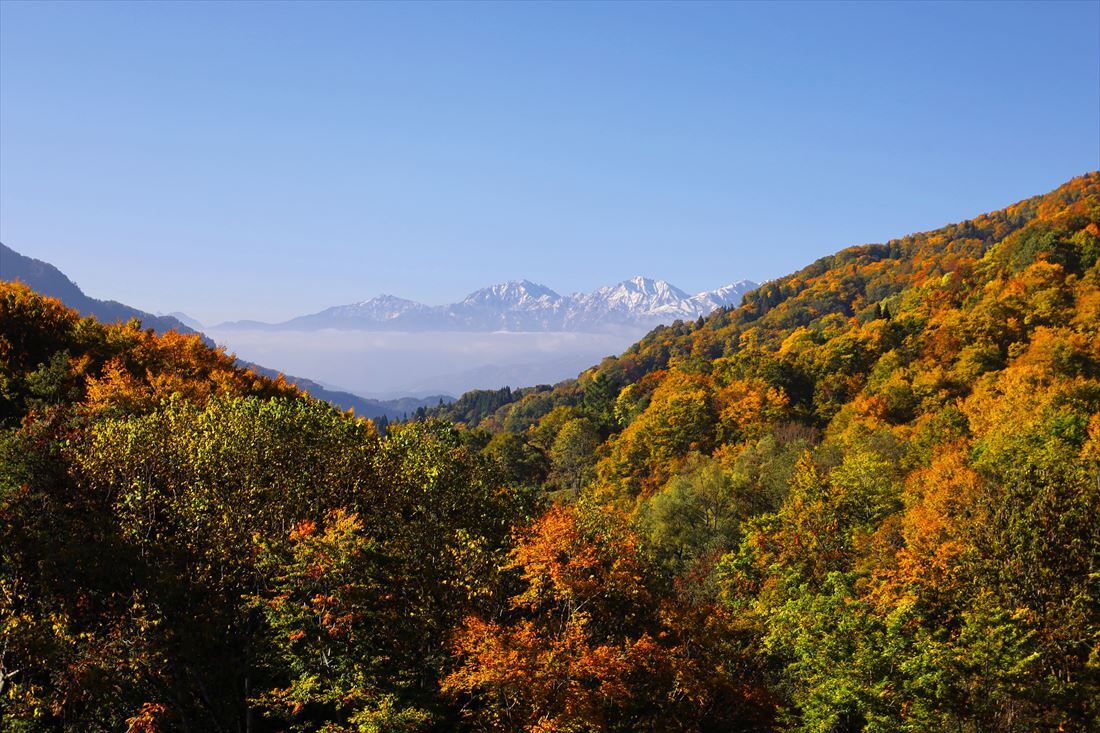 お部屋から望む北アルプス方面は3段紅葉が見られます。ずっと眺めていたい景色ですね。